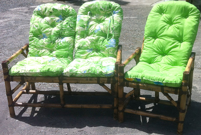 Conjunto Sofá 2 lugares, 2 poltronas e mesa de centro produzidos em bambú tratado, e 04 almofadas.